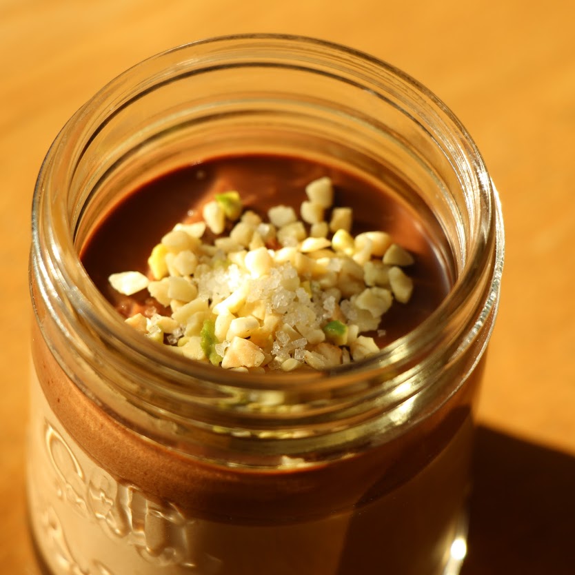トッピングはチョコと相性のいい、ピスタチオ入りの3種クラッシュナッツにカリッと食感のいい”潮の粒”をかけて頂きます。