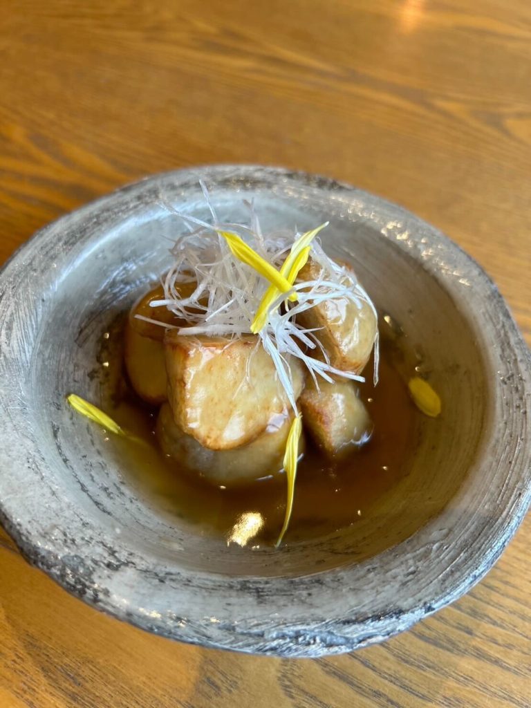 粉をまぶして外はカリッと、中はホクホクに揚がった里芋にたっぷりとあんをかけて仕上げました!!(価格 500円)
