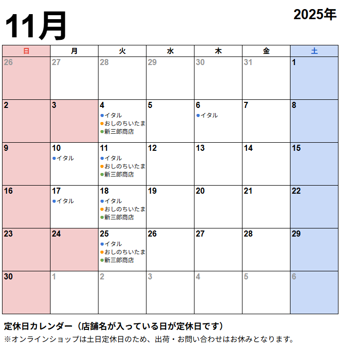 工房とったん 新三郎商店 ゴハンヤイタル おしのちいたま 2025年10月28日いつも、工房とったん、新三郎商店、ゴハンヤ イタル、おしのちいたま、オンラインショップをご利用いただき誠にありがとうございます。2025年11月の営業を下記のとおりお知らせいたします。