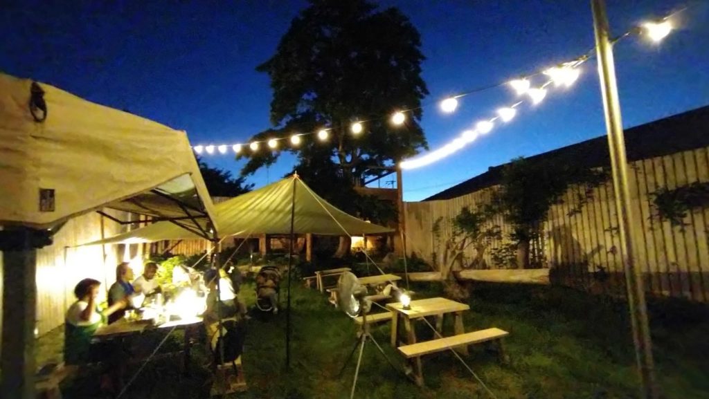 『暑い夏がやってきた!外で飲むビールが最高にうまいのだ!』おしのちいたまビアガーデン「麦酒庭(ばくしゅてい)」街の一角の隠れた庭はまるで秘密基地のよう。(シーソーもあるよ)